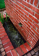 Die Neugliederung der Räume in dem bestehenden Garten erfolgt mit Hilfe einer Mauer aus altem Klinker. Aus dieser Mauer läuft durch einen Überlauf Wasser und fliesst in das vorgelagerte längliche Wasserbecken.