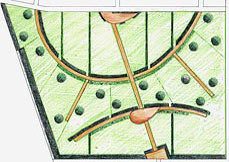 Durchstossen werden die Bögen von dem Hauptweg an dessen Schnittpunkten zwei Plätze angeordnet sind.